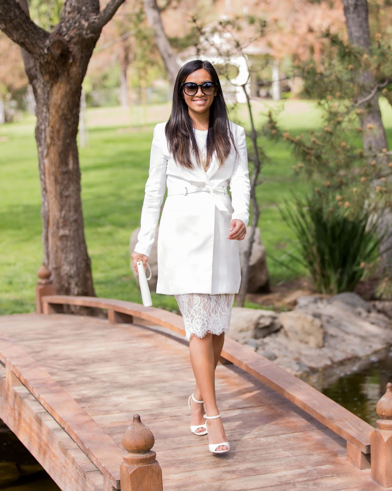 Instead of the obvious jeans and tee look, I wanted to incorporate this pineapple graphic tee with a more feminine and girly feel, pairing it with a lacy skirt, and wearing a blazer dress jacket over, which creates that mysterious and sophisticated edge. In addition to the peek of lace which also creates that sexy yet sleek vibe to the overall look. And lastly, a pair of white strapped heels and a white clutch to complete that head to toe all white look.