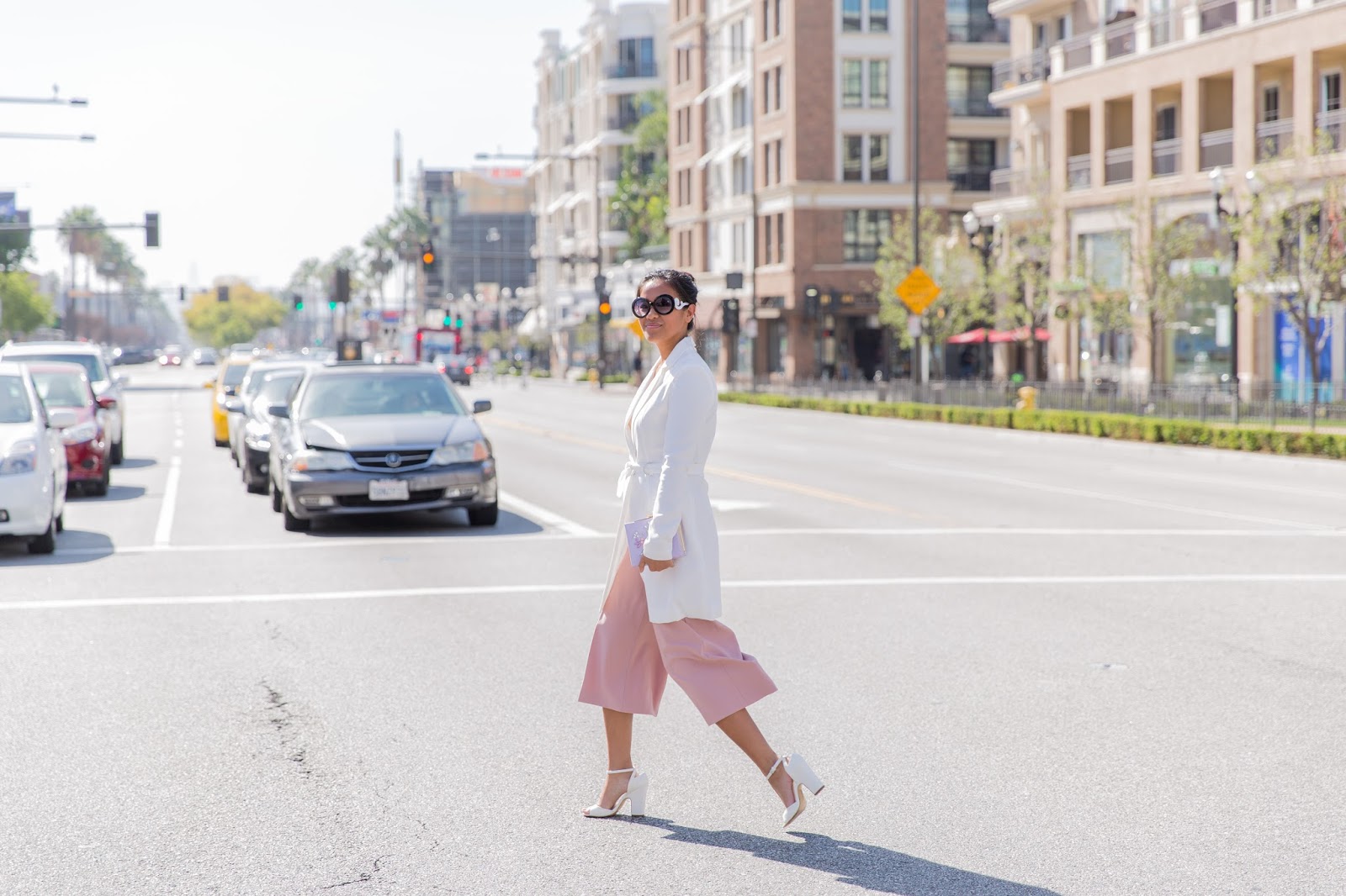 This look is effortlessly simple yet is sophisticated and clean. Culottes are very versatile, and are a great pair to transition to day and night. Pairing it with a blazer dress like this one finishes off that sophisticated and sleek look.
