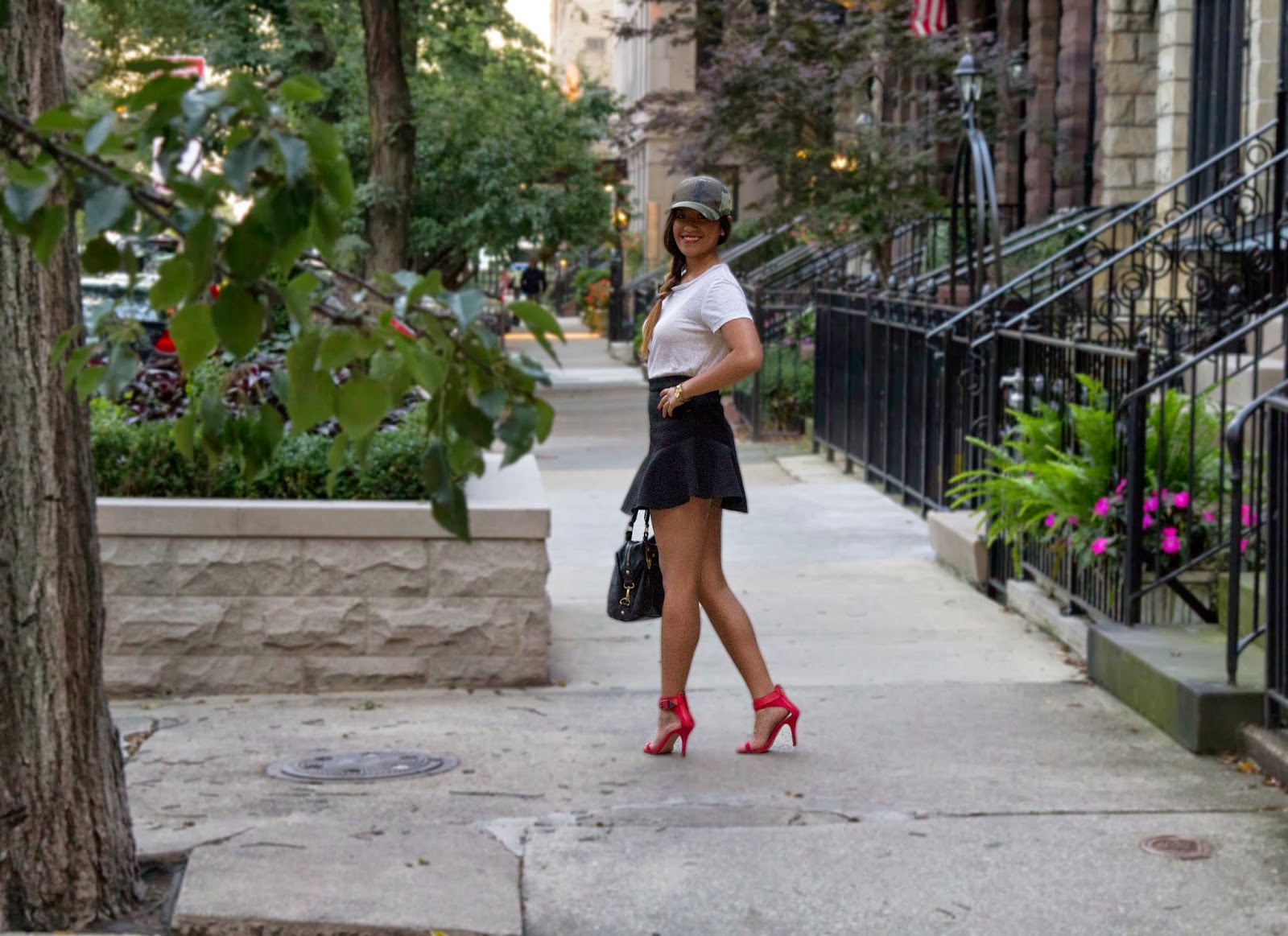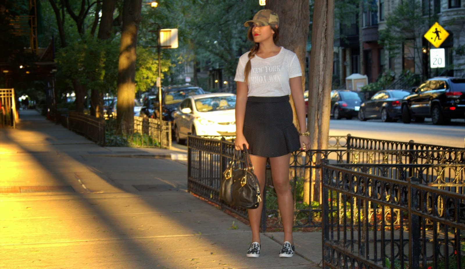 Happy Fall Loves! Chicago has been up and down when it comes to weather; what else is new? Looks like this week will be mid 70’s! And I hope it stays that way! 🙂 Skirts and strapped heels are my two favorites no matter what season it is. I stuck with dark colors, and accessorized it with my black handbag, camouflage baseball cap, and gold watch.