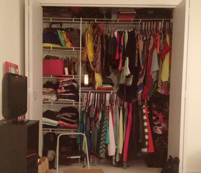I moved into a new place last weekend, and this is my new improved closet! Thank god for all these shelves! Sadly, I need more space…..