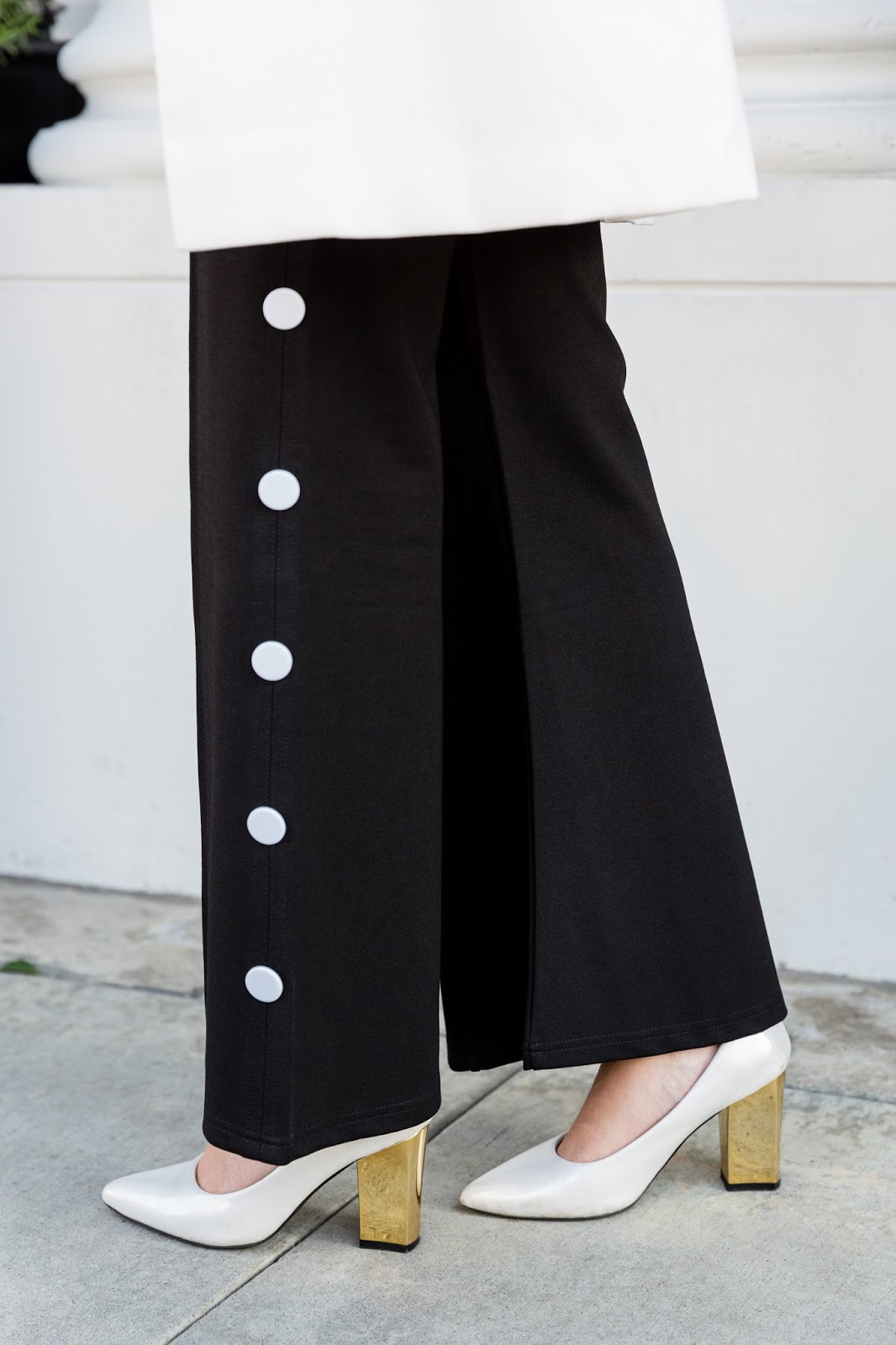 From the simple black pant to the white buttoned down detail along the side of the pant creates an elegant fashion masterpiece.