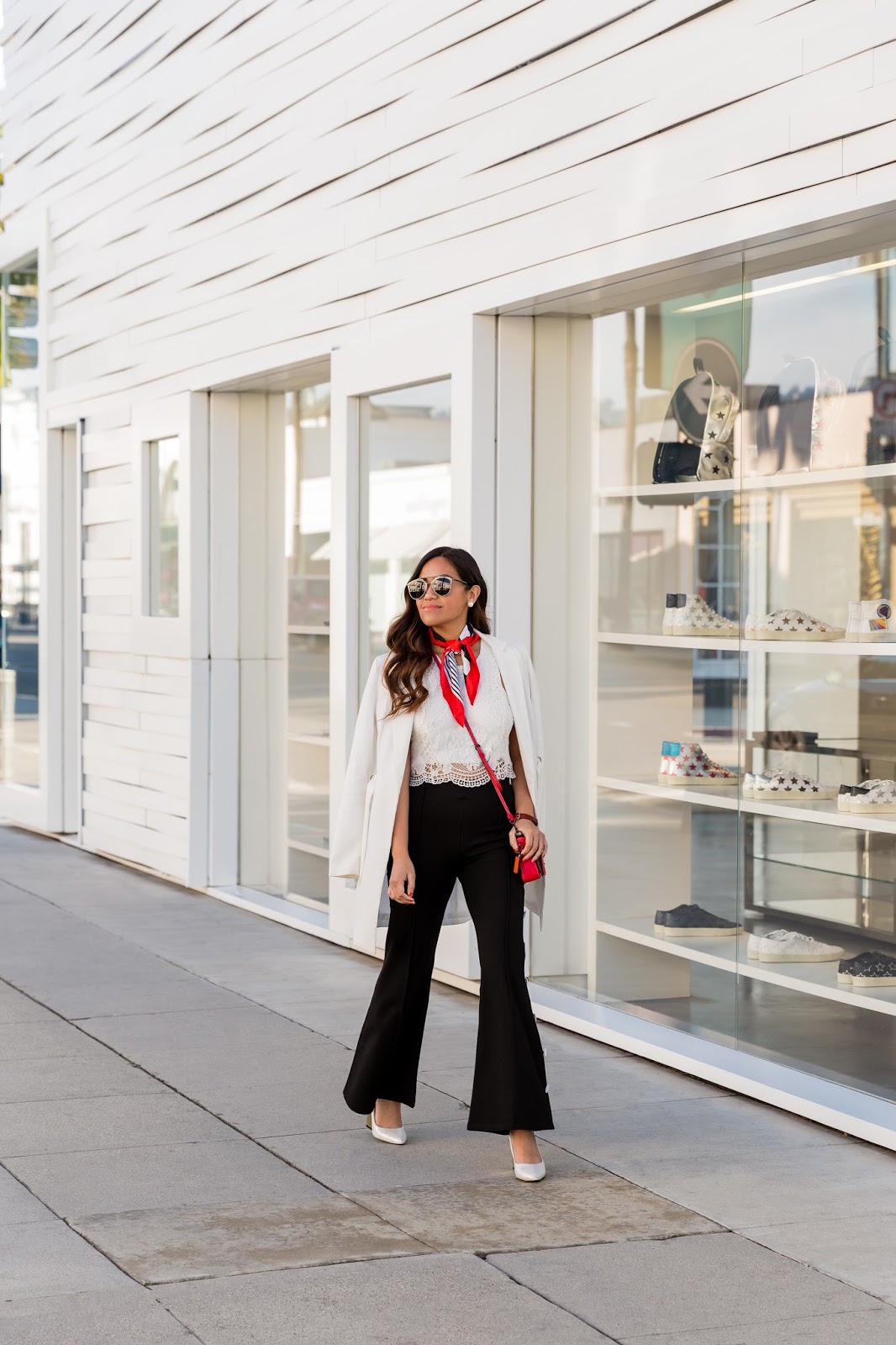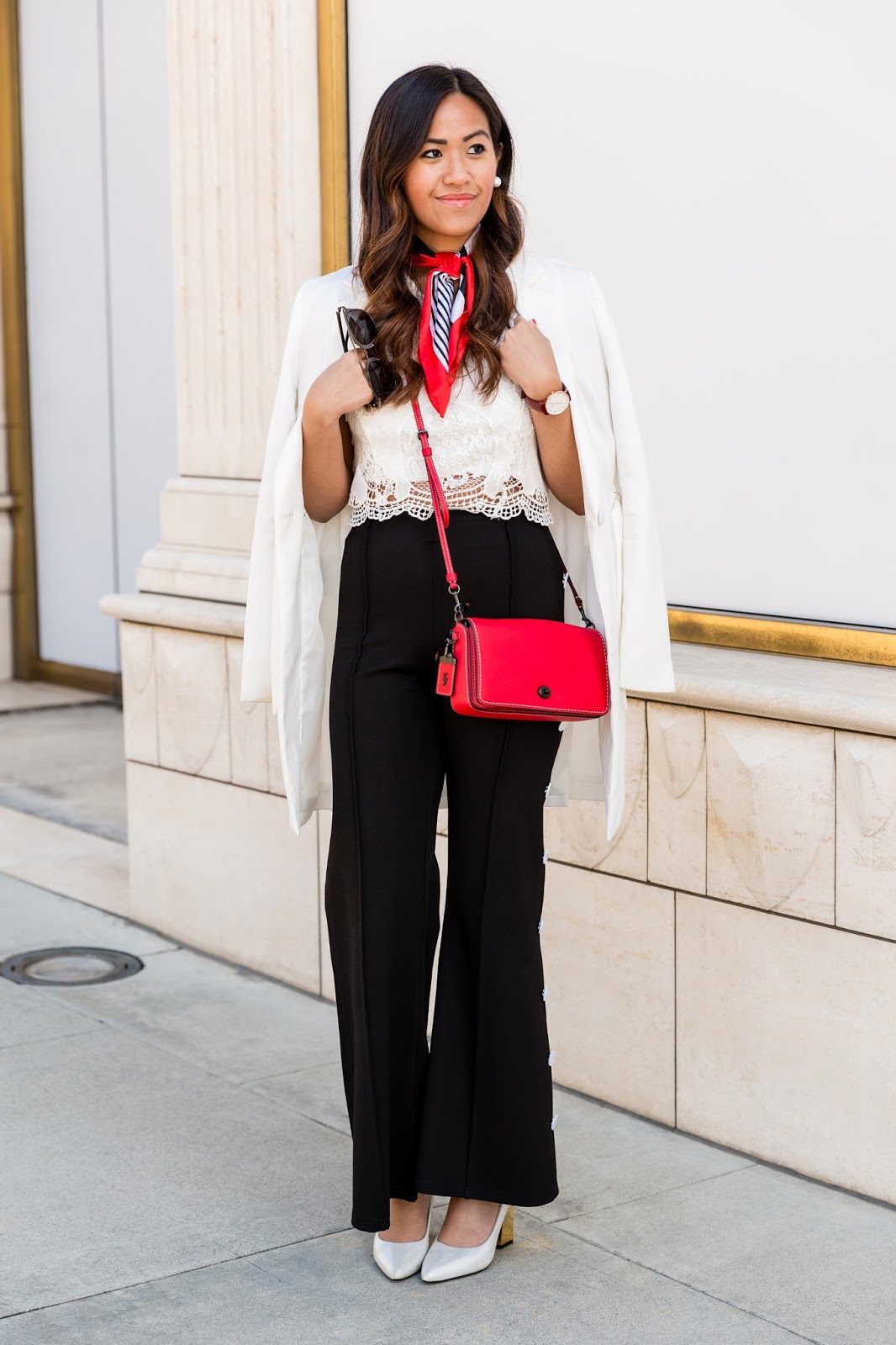 Creating the chicest outfit yet – I matched the white buttons with white pieces such as a pretty lace crop top, a classy white blazer and white pointy heels. With an overall black and white look and to elevate this look, I accessorized with pops of color – a gorgeous dark pink cross bodypurse, watch and a stylish scarf.