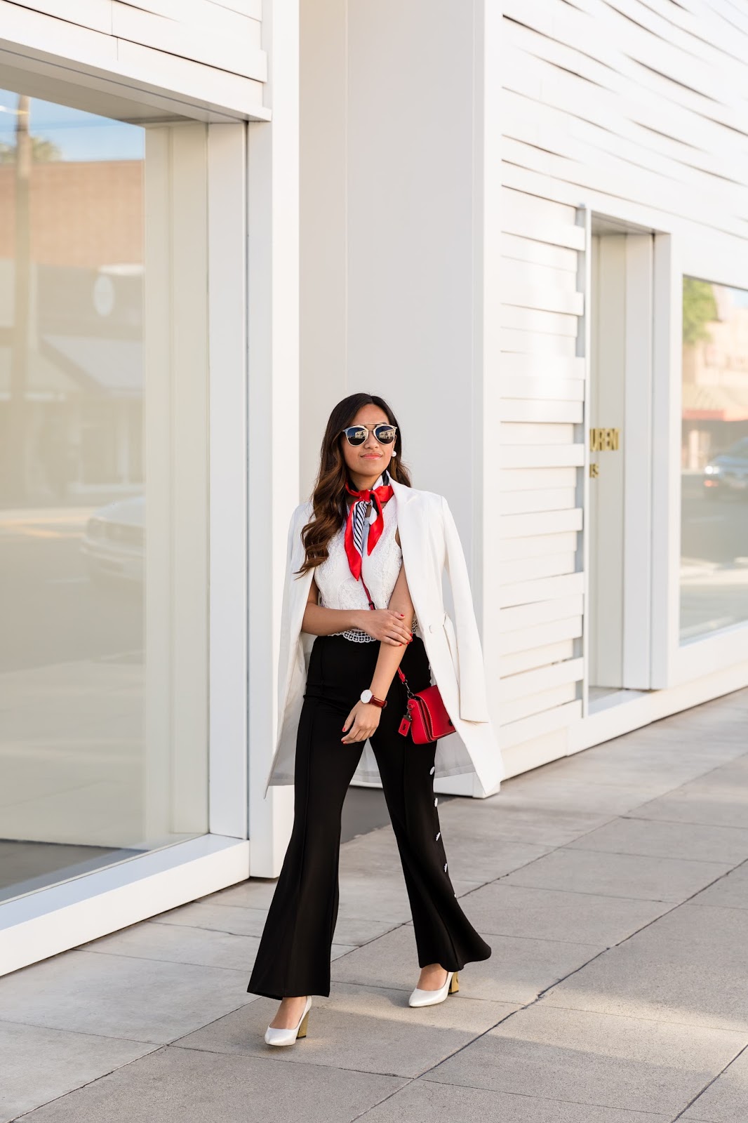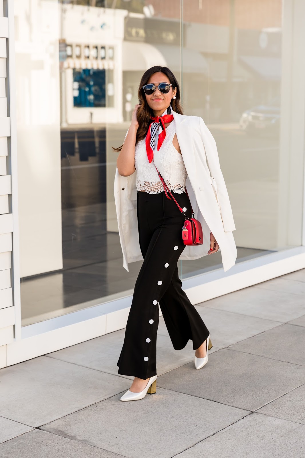 Creating the chicest outfit yet – I matched the white buttons with white pieces such as a pretty lace crop top, a classy white blazer and white pointy heels. With an overall black and white look and to elevate this look, I accessorized with pops of color – a gorgeous dark pink cross bodypurse, watch and a stylish scarf.