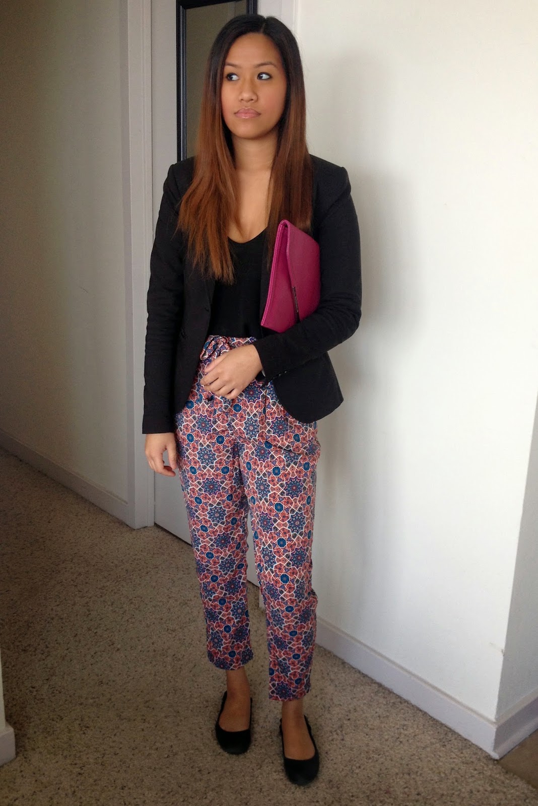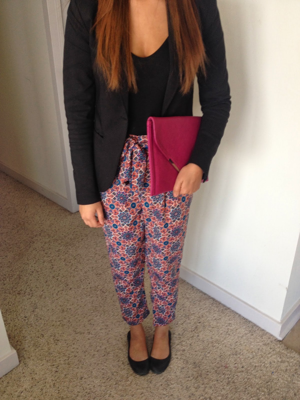 I got these pants from Forever21 last year! But you can find geometric printed pants anywhere, that would look great with this look! I am in love with the print patterns! Here is one that I found just now while trying to look for a similar pair: PRINTED PANTS. <3 SO CUTE! Would be super cute with red strapped heels! I seriously cannot wait for 70 degree weather, counting down the days to wear my heels again! Eee! 😀