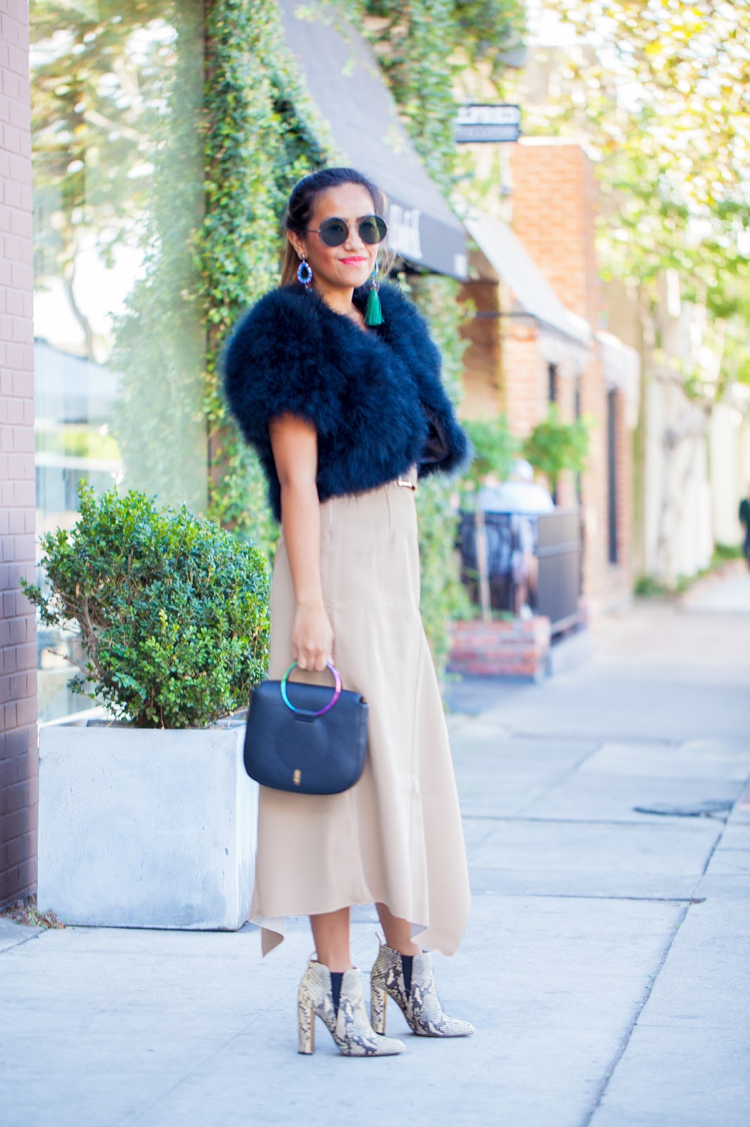 I paired this shrug with a fun asymmetrical midi skirt; which I absolutely adore. This skirt is super fashion-forward, unique and chic! Creating a fabulous look from head to toe – it wouldn’t be complete without some snake-printed booties and color popping tassel earrings by Sequin. Lastly, accessorize with black pieces such as these versatile sunnies (that look great on every outfit!) and a black purse.