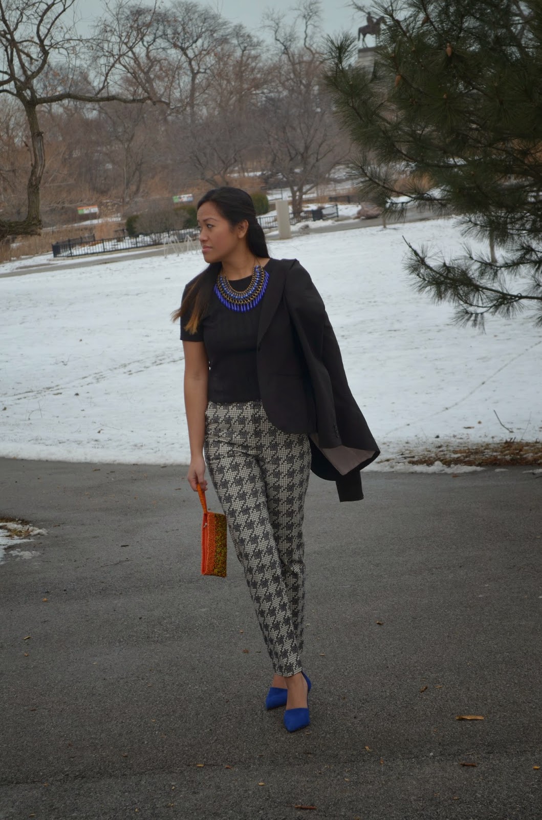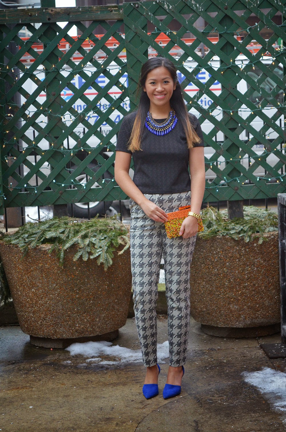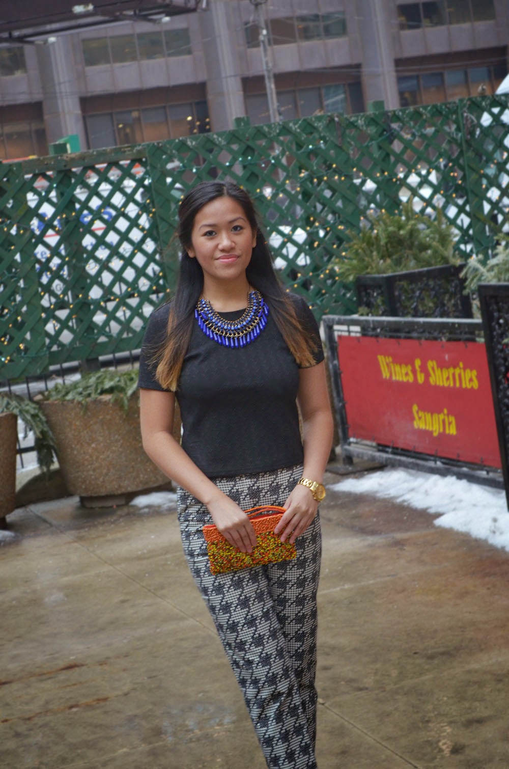 Houndstooth has always been one of my favorite prints to wear. The print itself is very versatile, which I love most about it. I didn’t want to keep my outfit too simple, so I decided to accessorize my houndstooth pant with the color blue and add a finishing touch with a multi- orange colored clutch.