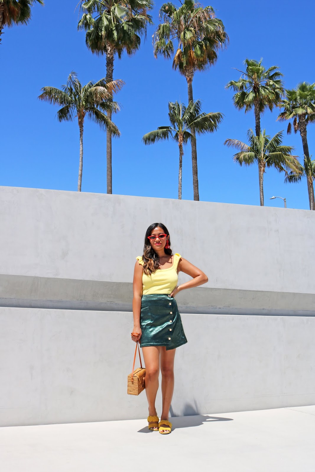 Color may be intimidating for some; but there is no need to be! In fashion nowadays, a lot of color mixtures actually turn out to be amazing! One of my favorite combos is the yellow and green combo. As shown below, I chose to pair my mini skirt with a simple yellow top and fun yellow sandals. Easily finished off the look with red (another color that pairs well with yellow!) sunnies and red statement earrings, and lastly a summery straw handbag. This outfit can be worn by anyone, and extra points for those with darker skin tones as this outfit surely will make you pop and glow!