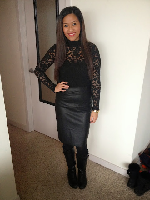 Here’s a different look with wearing a leather long skirt. This lacy black turtle neck cropped top I bought from Tobi last year. I always get compliments whenever I wear it!!