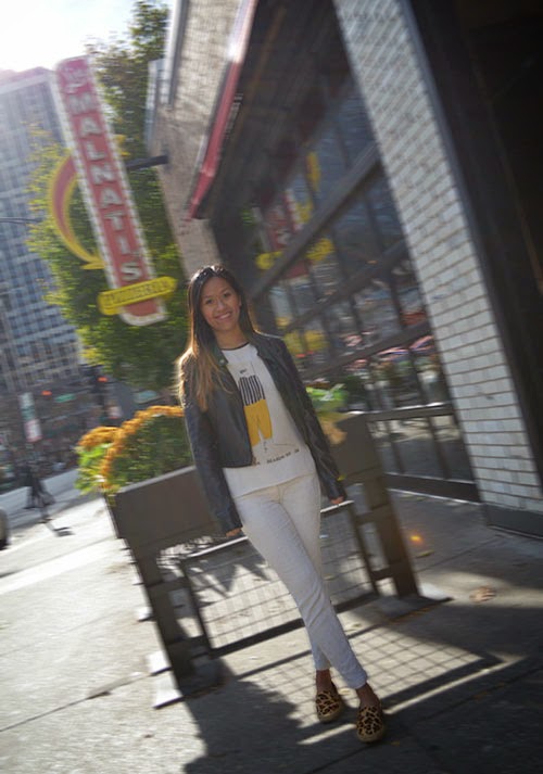 Who says you can’t wear white after Labor Day?? White after Labor Day is totally A–OKAY to wear, so don’t be afraid to rock it out! These cream jacquard textured pant from H&M is one of my favorite pieces in my closet. The texture on the pant adds flavor, and the zipper at the bottom back of the pant allows you to wear it multiple ways. This shirt that I bought from ZARA a while back can be worn with everything, I styled it with a recent outfit here. I finished off this look with a black leather jacket and my cheetah printed slip-ons. This look is more on the casual side, great to just throw on for some errands or a Sunday brunch or football day.