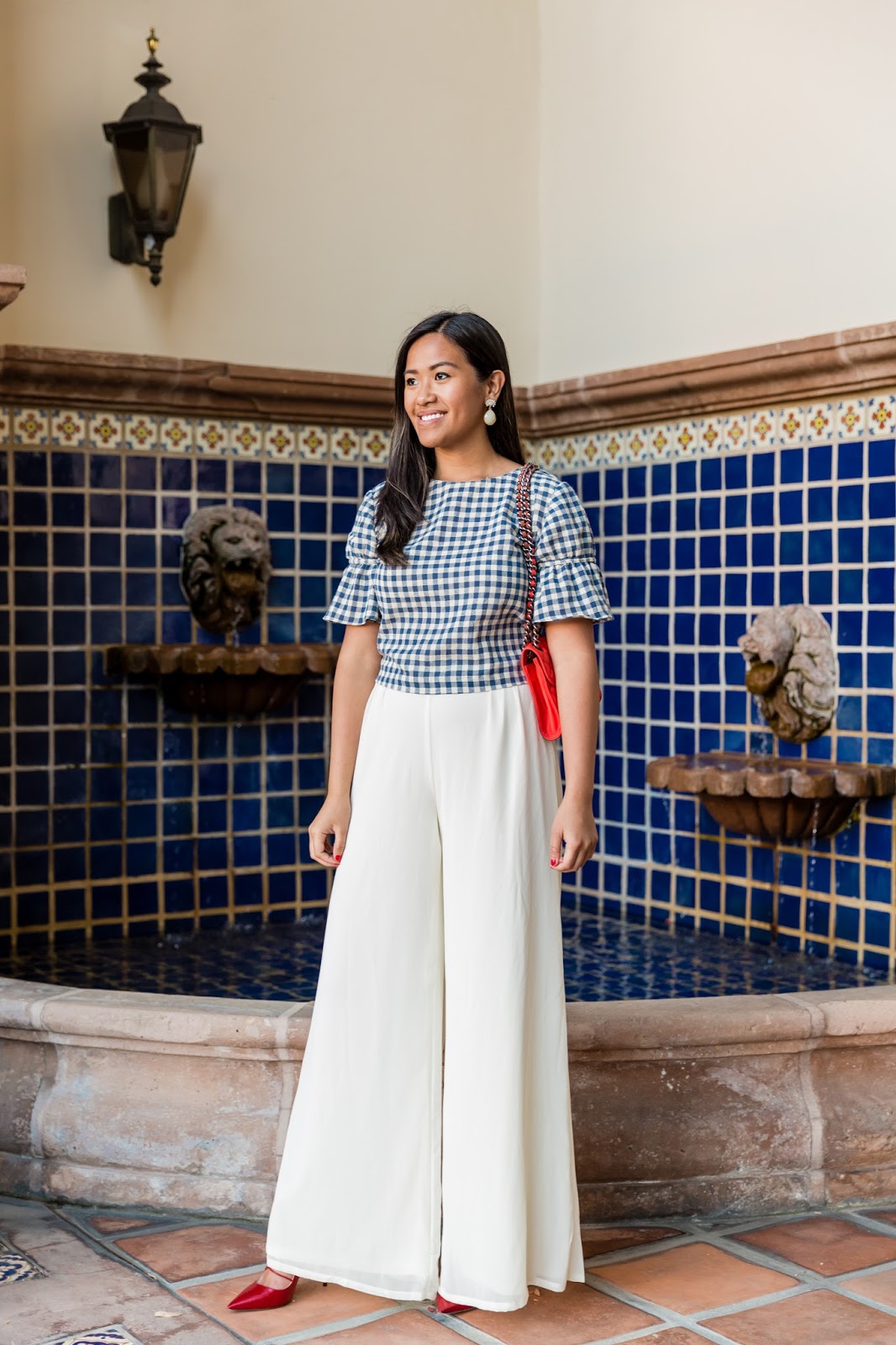 Summer is never complete without a pair of high waisted palazzo white pants and a gingham printed crop top, a perfect combo for any casual summer day.