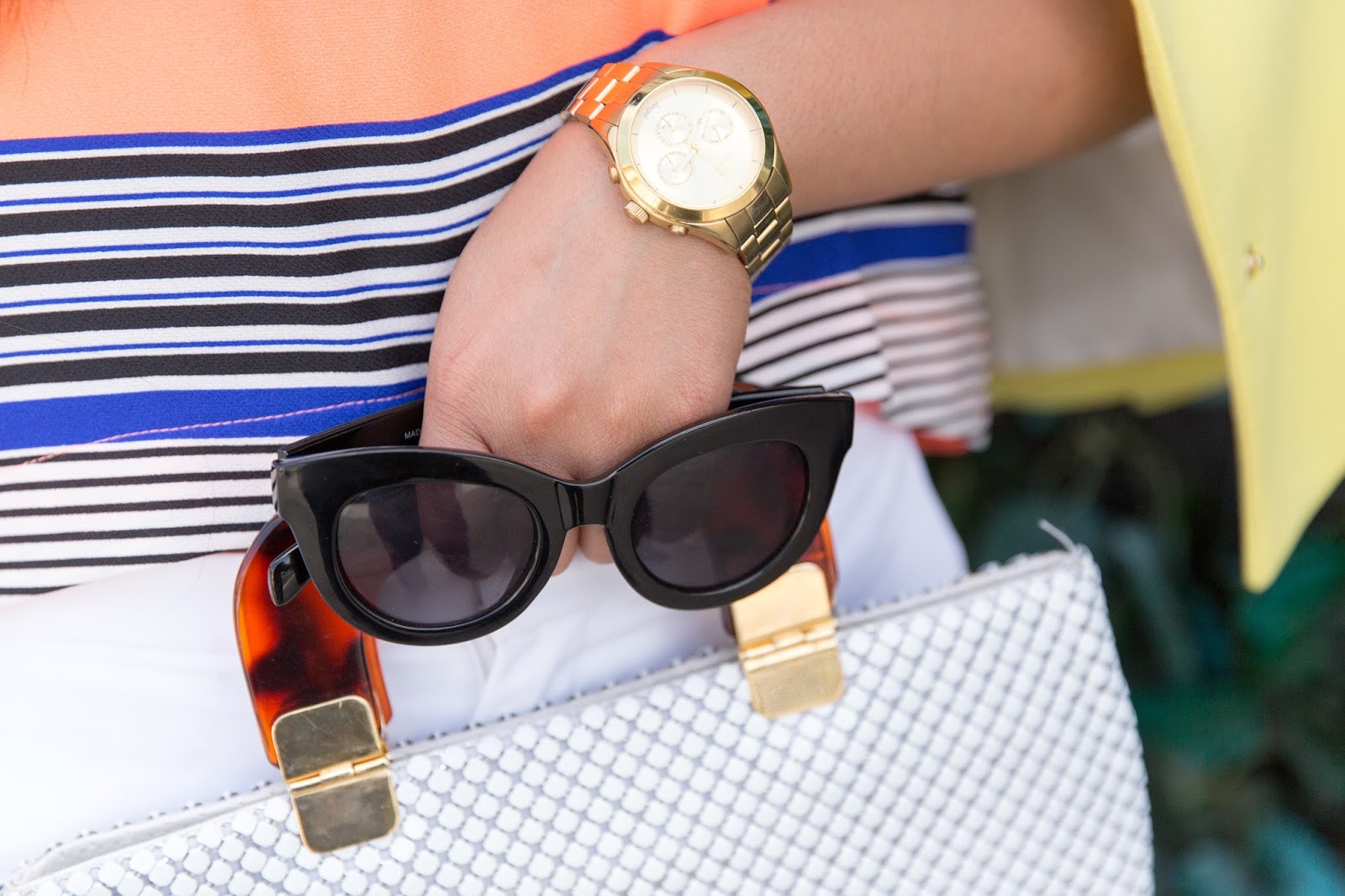 I accessorized with a white vintage purse, cat-eyed sunglasses. a gold watch, and a light pair of black strapped heels to finish my look off.