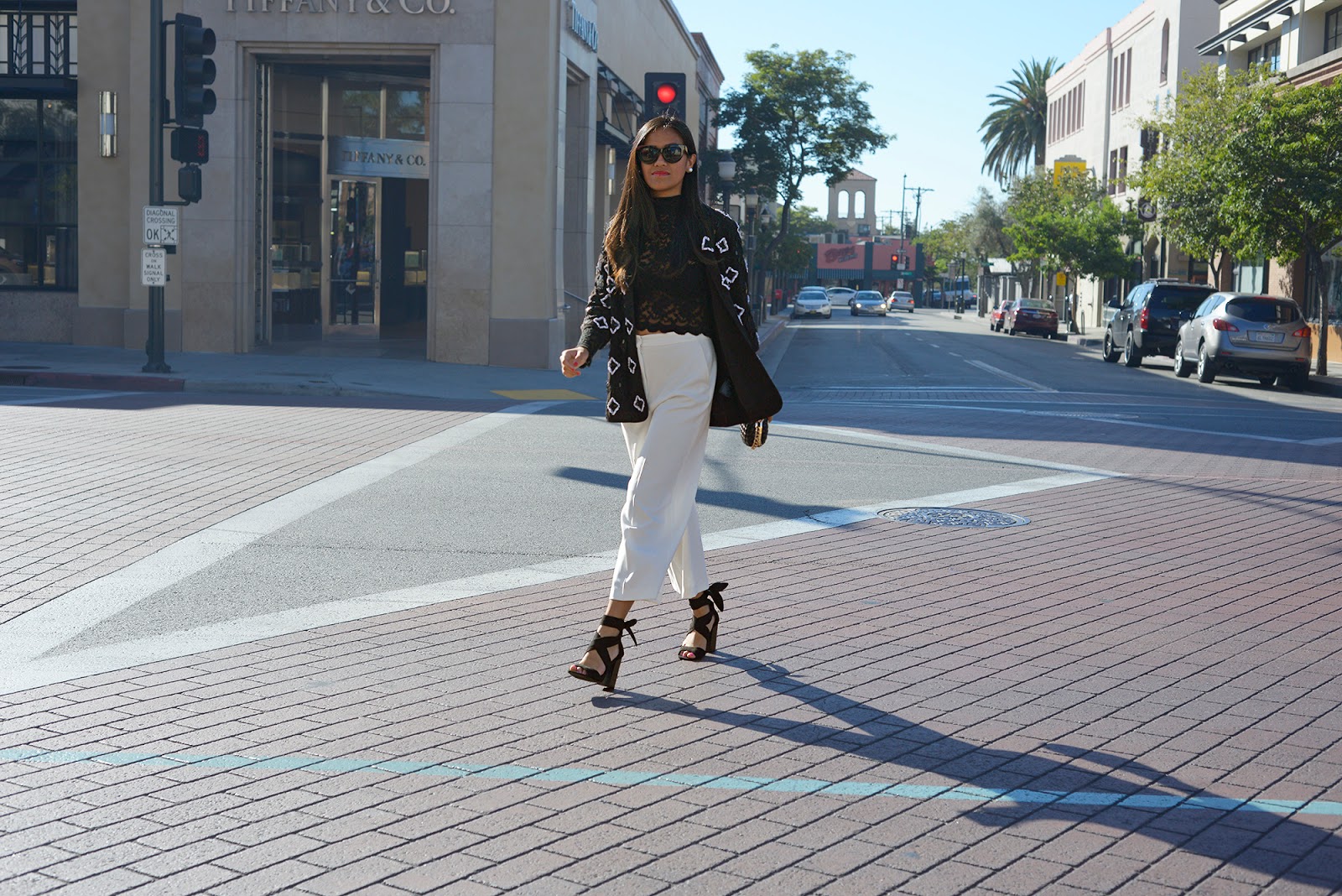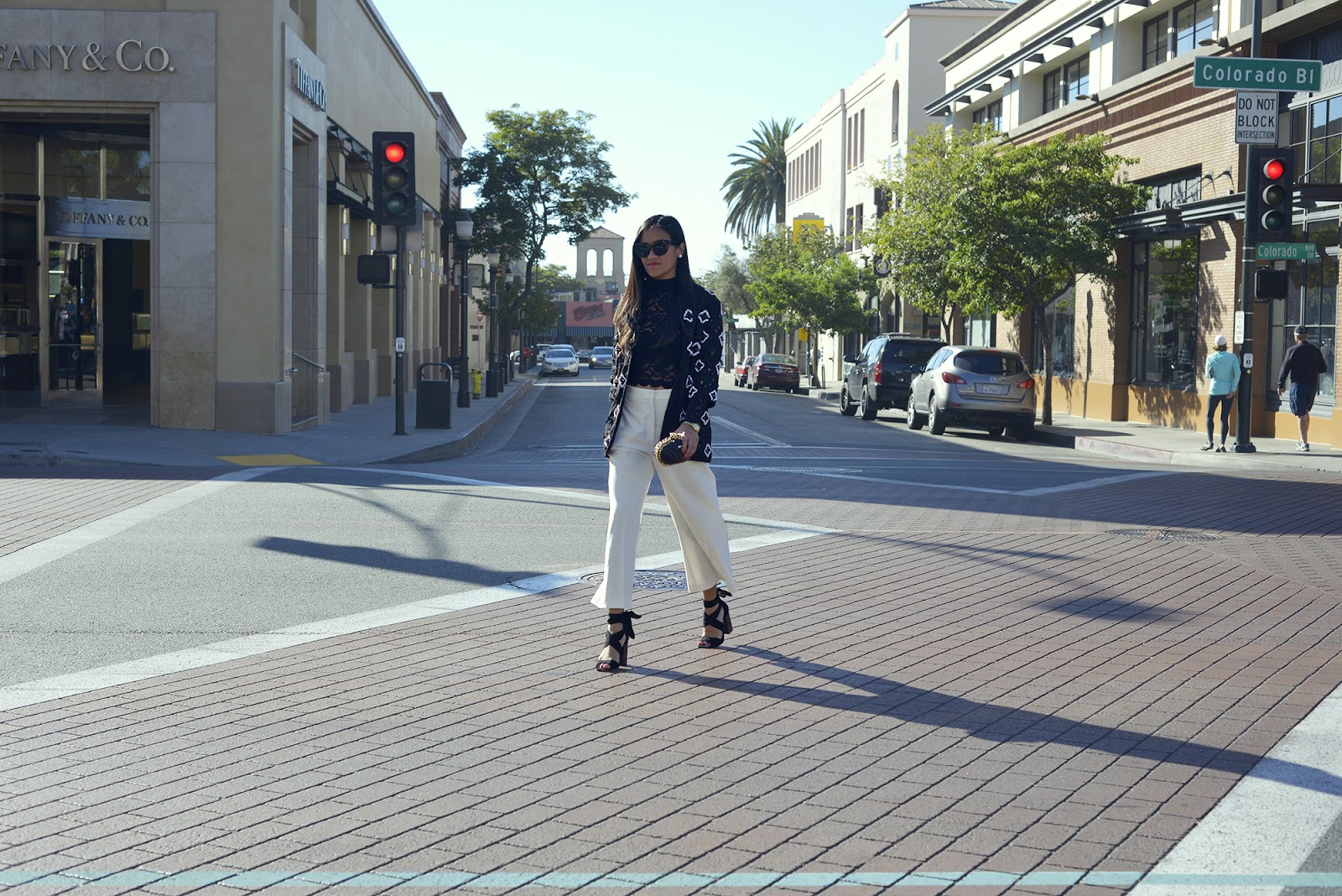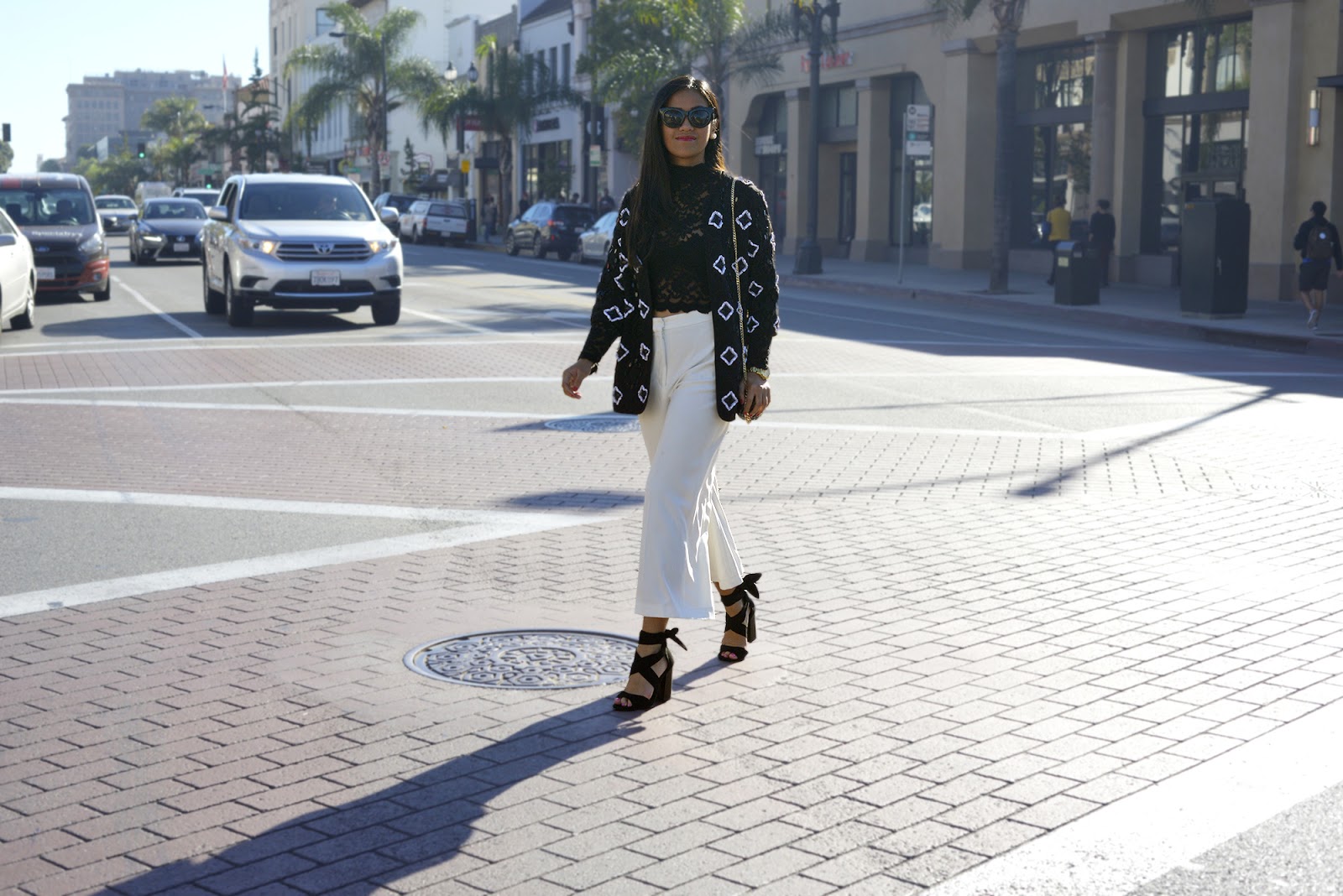 Secret to mixing pieces is finding a base piece that can easily be worn various ways. For instance this beaded jacket can easily be worn (you’d be surprise) with a variety of colors and prints and is the main piece of this look. I styled it with a lace crop top, white culottes and finished it off with some cute lace up heelspaired with a beautiful clutch from Nicole Lee.