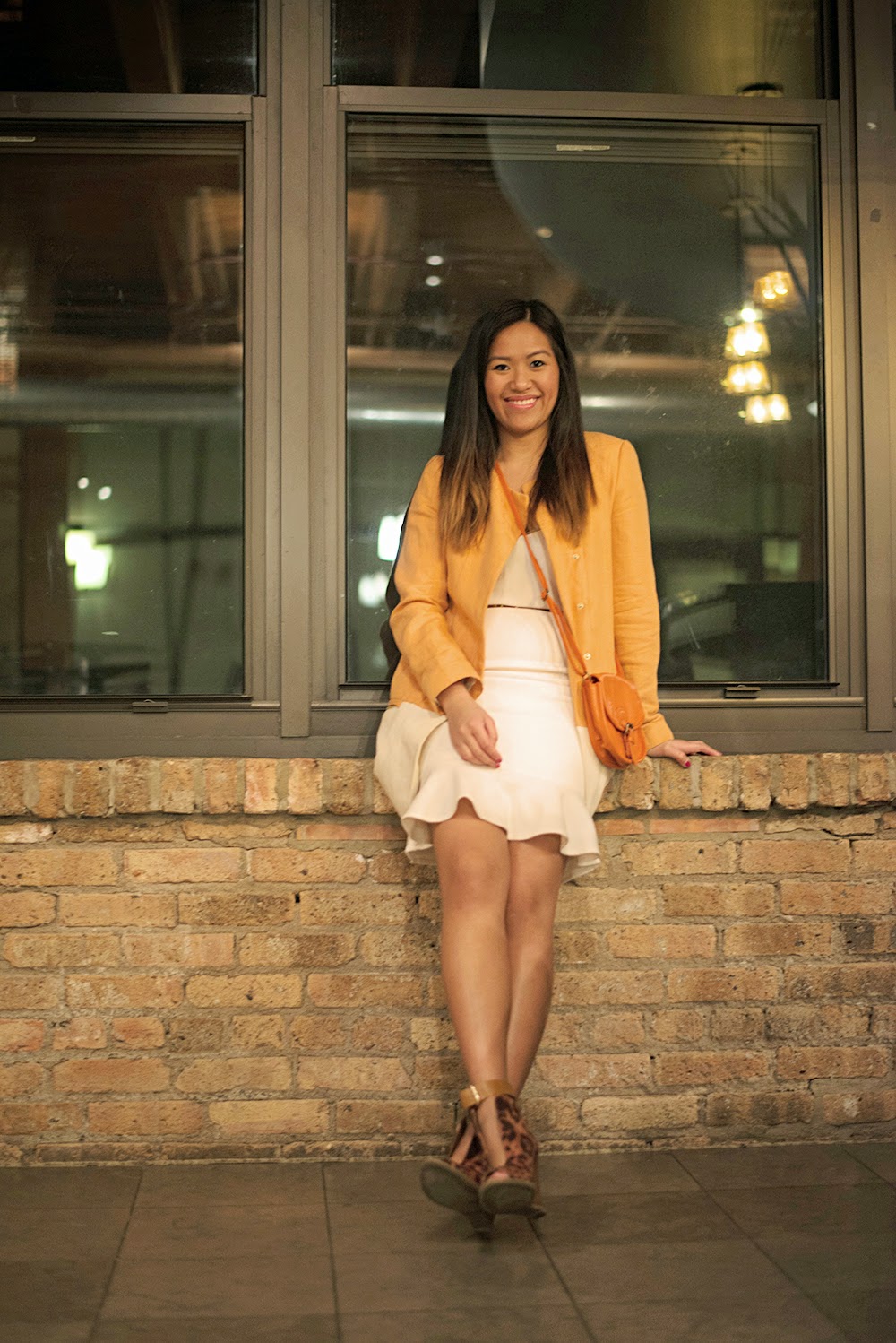Since the coat is already a bold component itself, I wanted to keep my underneath outfit simple, with a bit of flare, and a snakeskin skinny belt. To keep your look clean but playful, wearing a printed shoe like a cheetah, giraffe, anything brown/tan would help to finish off this springy look. And lastly this orange mini crossbody bag makes this outfit a little bit more orange :)!