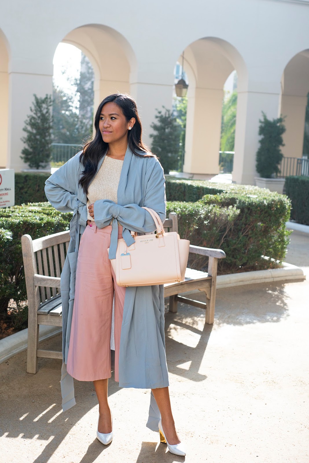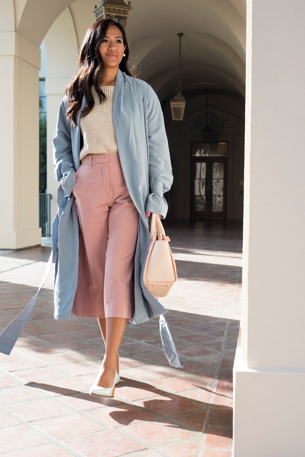 I love being able to play with colors and creating something unique in the end. Like this beautiful blue longline coat complements well with these light purple colored culottes and light peach colored purse; which creates an easy-eye fall look.