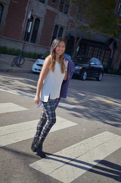Happy Monday Loves! Can’t believe it’s already November, and we have two more months left of this year, where did the time go?! This past weekend my roommate and I decided to go to a few shops in Lincoln Park. Among those few shops, we came across a really cute boutique called Elle Val, located on 2320 N Clark, which we fell in love with. As I was going through their sale rack, I came across these gorgeous plaid leggings! I have actually seen something similar online, and thought to myself, I really need something like these! These leggings were definitely a Fancista Find, as they were on sale for $25! What a steal! I paired my plaid leggings with a white sleeveless blouse, white statement necklace and my black booties. These leggings would look great with a grey knit sweater as well.