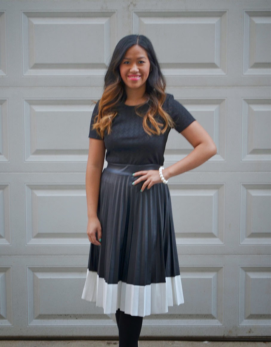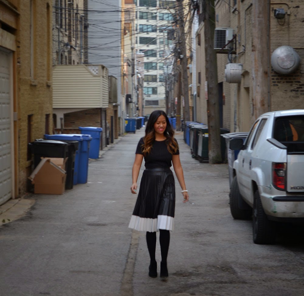 I have always wanted a pleated midi skirt, and two weeks ago I finally came across one that I really liked.  The skirt is from Akira, and was at a price of $29.90!  There are many ways to style this skirt, I styled this skirt with a black crop top, pearl bracelet, black tights (since it’s cold), black booties and a light pink lip for some color!