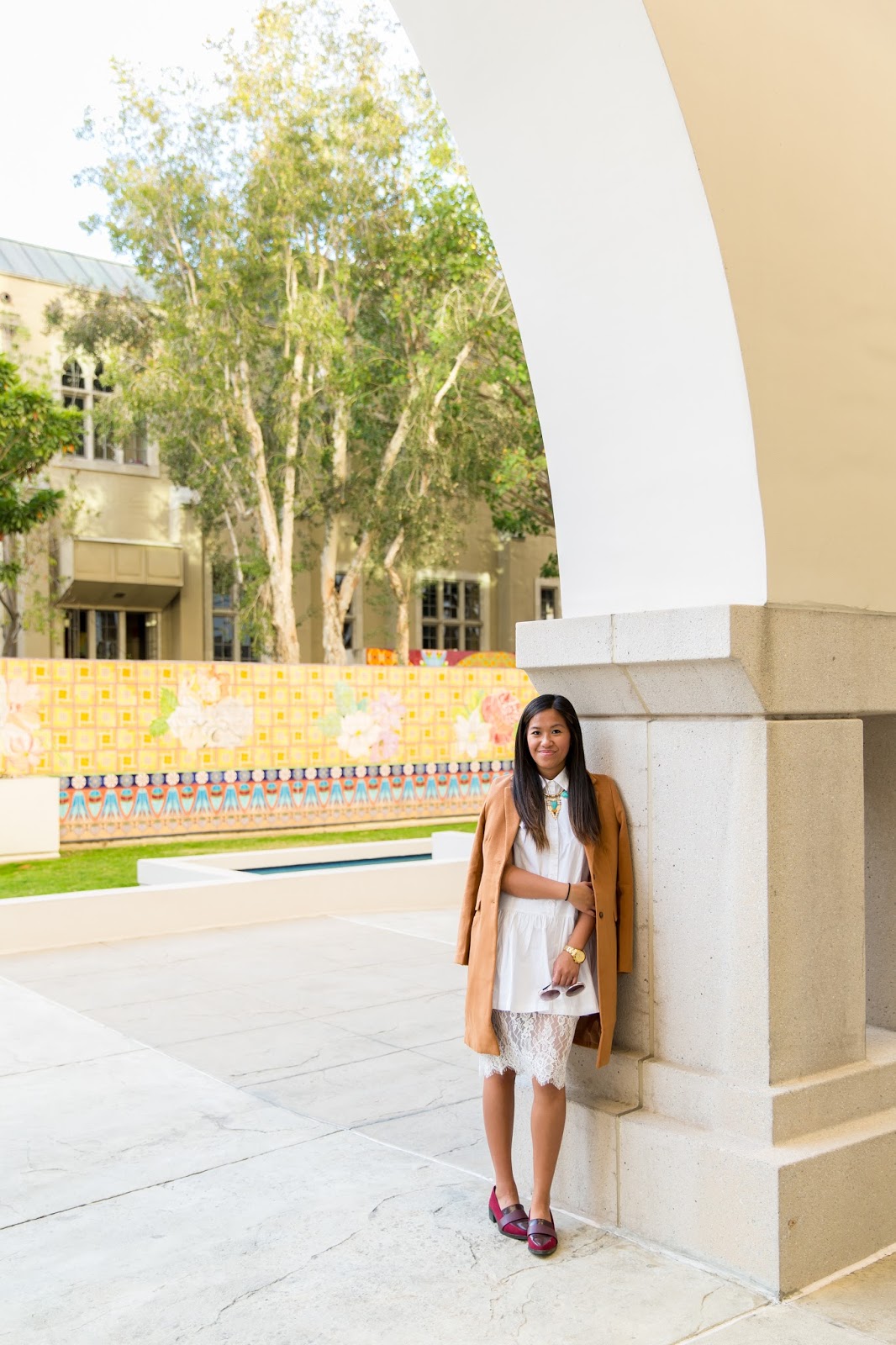 Today, I styled my camel coat with some unique pieces in my closet! Camel shaded colors go great with a variety of colors. My favorite colors that pair well are all neutral colors, black, gray, white but also an orangy red or even a maroon color, which is a great color this season. 🙂 With this look, I wore my white button down dress and underneath I paired it with a lace bottom trimmed skirt to give a more flirty/girly taste. I then accessorized with a blue statement necklace, a nude clutch and a maroon colored loafers (which are btw on sale!).
