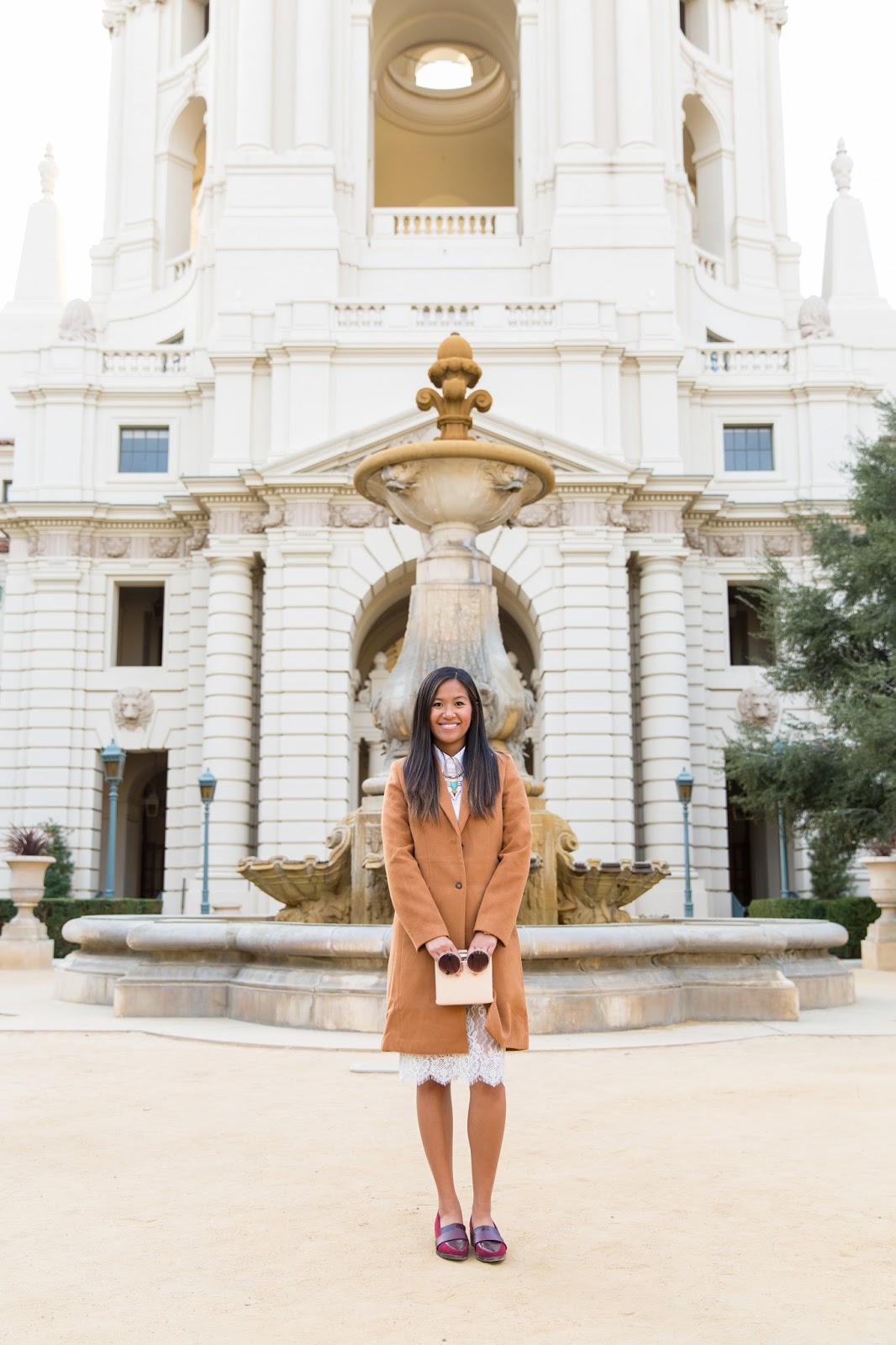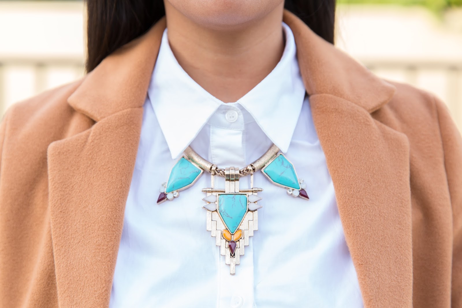 Today, I styled my camel coat with some unique pieces in my closet! Camel shaded colors go great with a variety of colors. My favorite colors that pair well are all neutral colors, black, gray, white but also an orangy red or even a maroon color, which is a great color this season. 🙂 With this look, I wore my white button down dress and underneath I paired it with a lace bottom trimmed skirt to give a more flirty/girly taste. I then accessorized with a blue statement necklace, a nude clutch and a maroon colored loafers (which are btw on sale!).