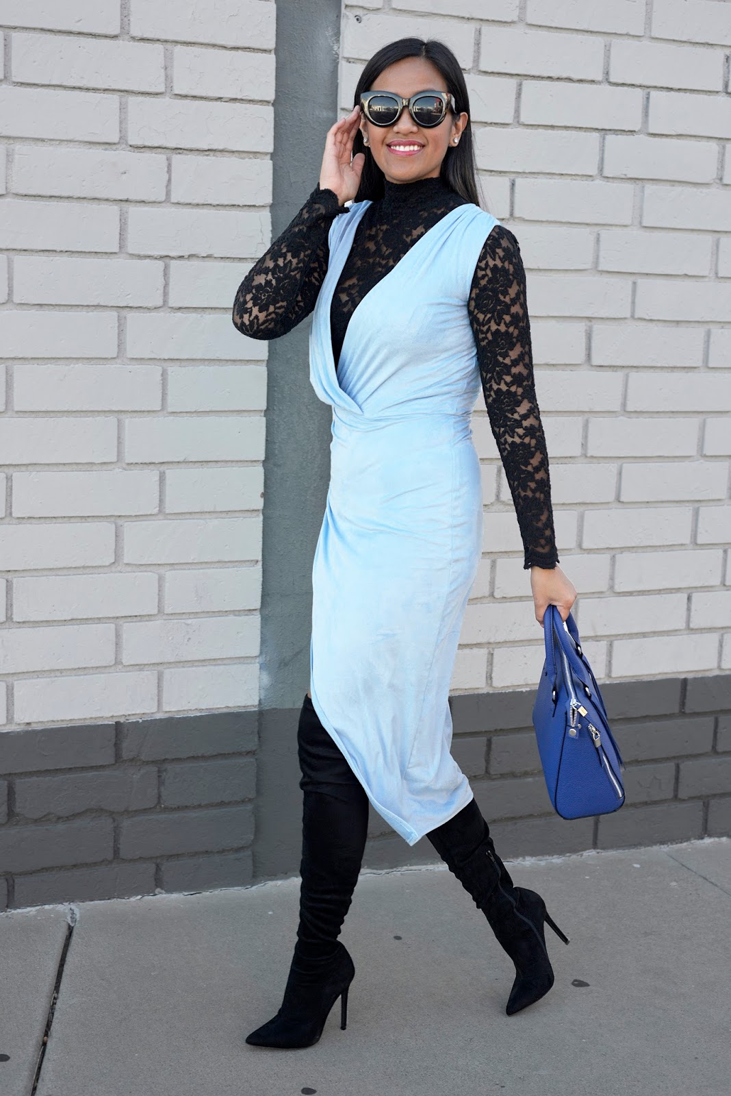 For today’s look, I took this sexy blue suede dress and layered it over a black lace crop top then paired it with thigh high suede black boots, {which are always an IT item for the upcoming seasons!}.