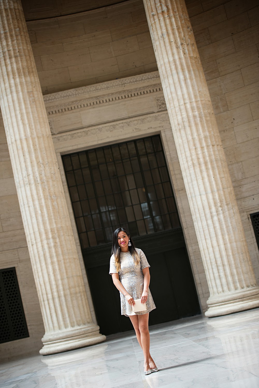 I love all the metallic touches to this look — it's so chic!! And that dress is the sort of dress that you will be able to wear for years thanks to the neutral pattern and classic shape. Love love love!
