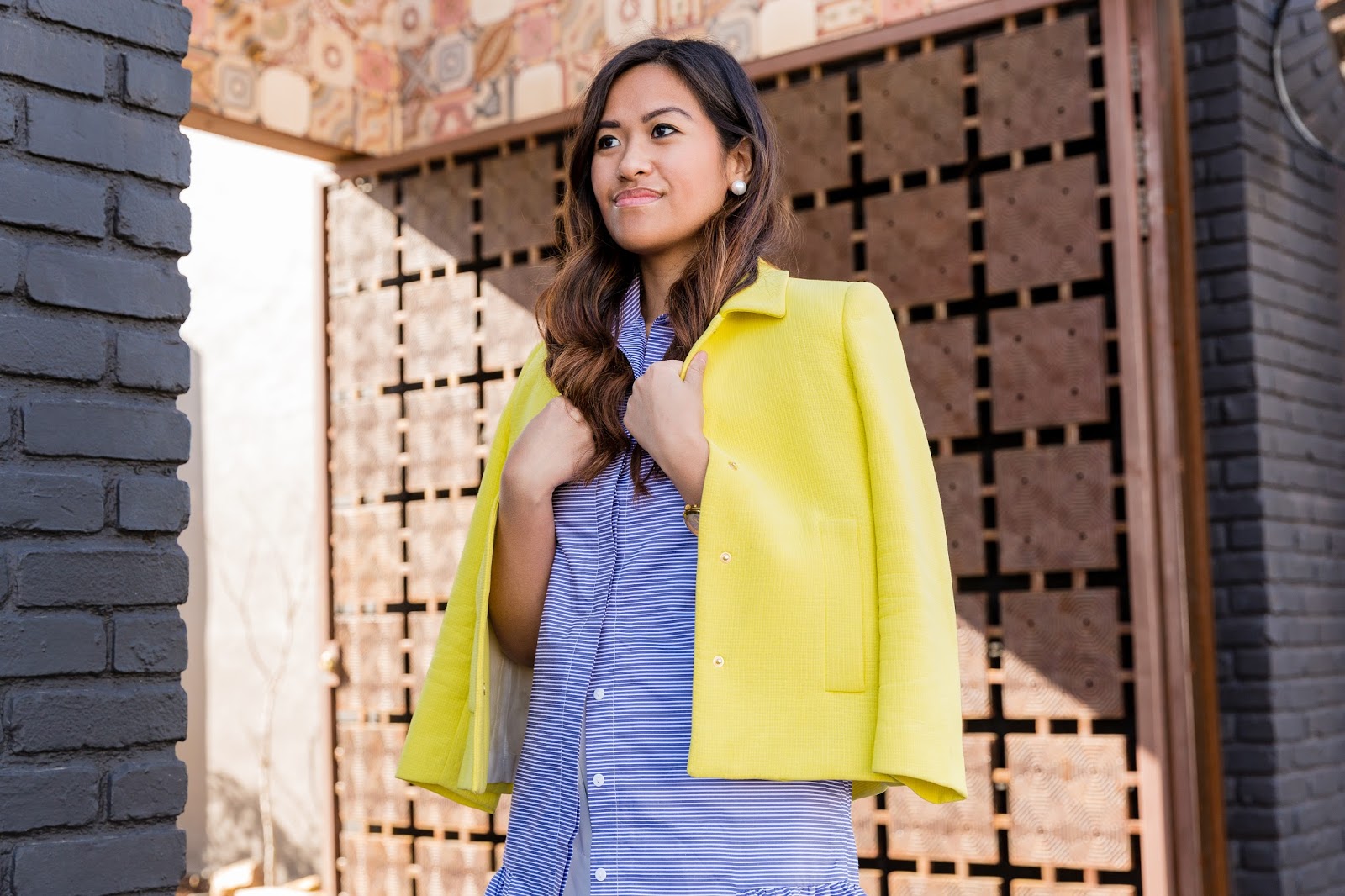 Easily transform your everyday look into spring with a simple “pop” of color such as this blazer. The yellow is so eye-catching and the perfect spring color. Some other great colors for this season can be pastel green, bright pink, light blue; find something that works for you!