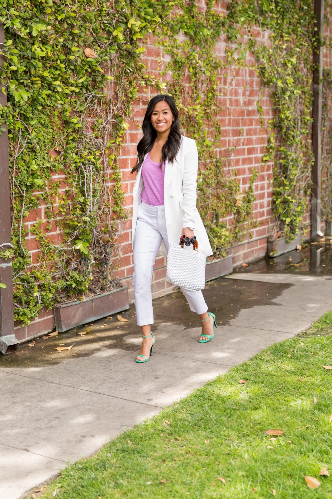 You can never go wrong with an all-white look, and with a touch of color such as this purple tee will surely help to brighten up that look. Lastly to complete this springy look, I paired it with my teal strapped heels. The look is sleek, chic and totally screams spring!