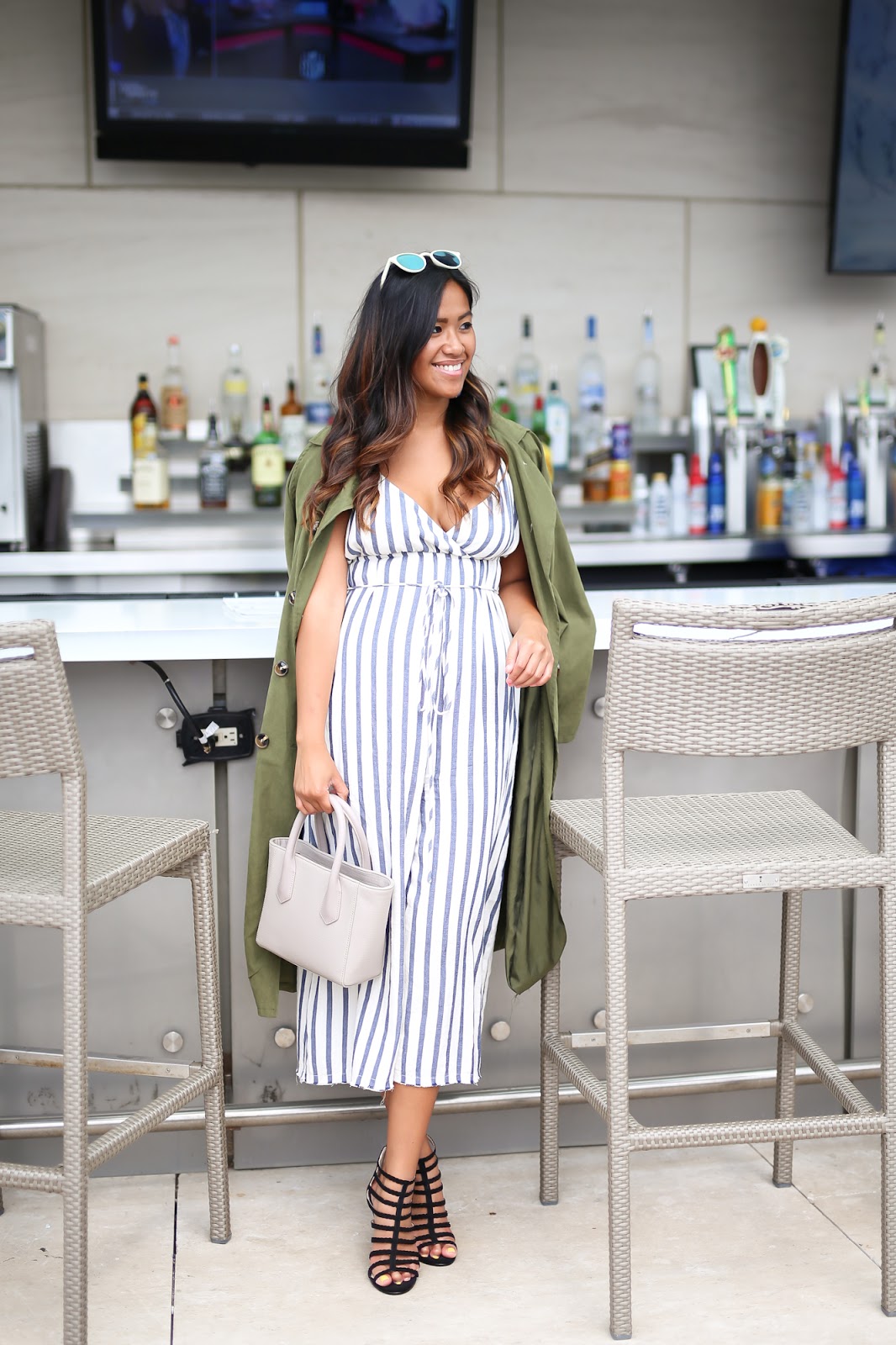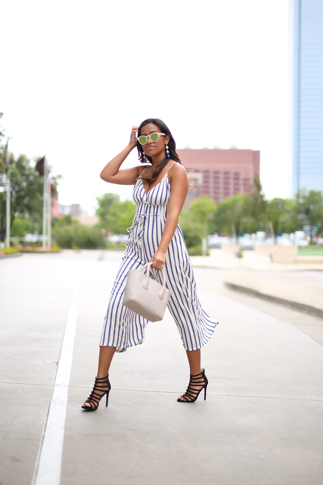 Jumpsuits are amazing must-haves to wear all summer long – as they are simple “easy to dress” pieces, very versatile and best of all, always look so put-together. Today I styled my jumpsuit with cute multi-blue striped pom pom earrings, a green military coat (which you can pair with both long or short coats), a gray mini tote, black strapped heels and paired it with rounded mirrored sunglasses.