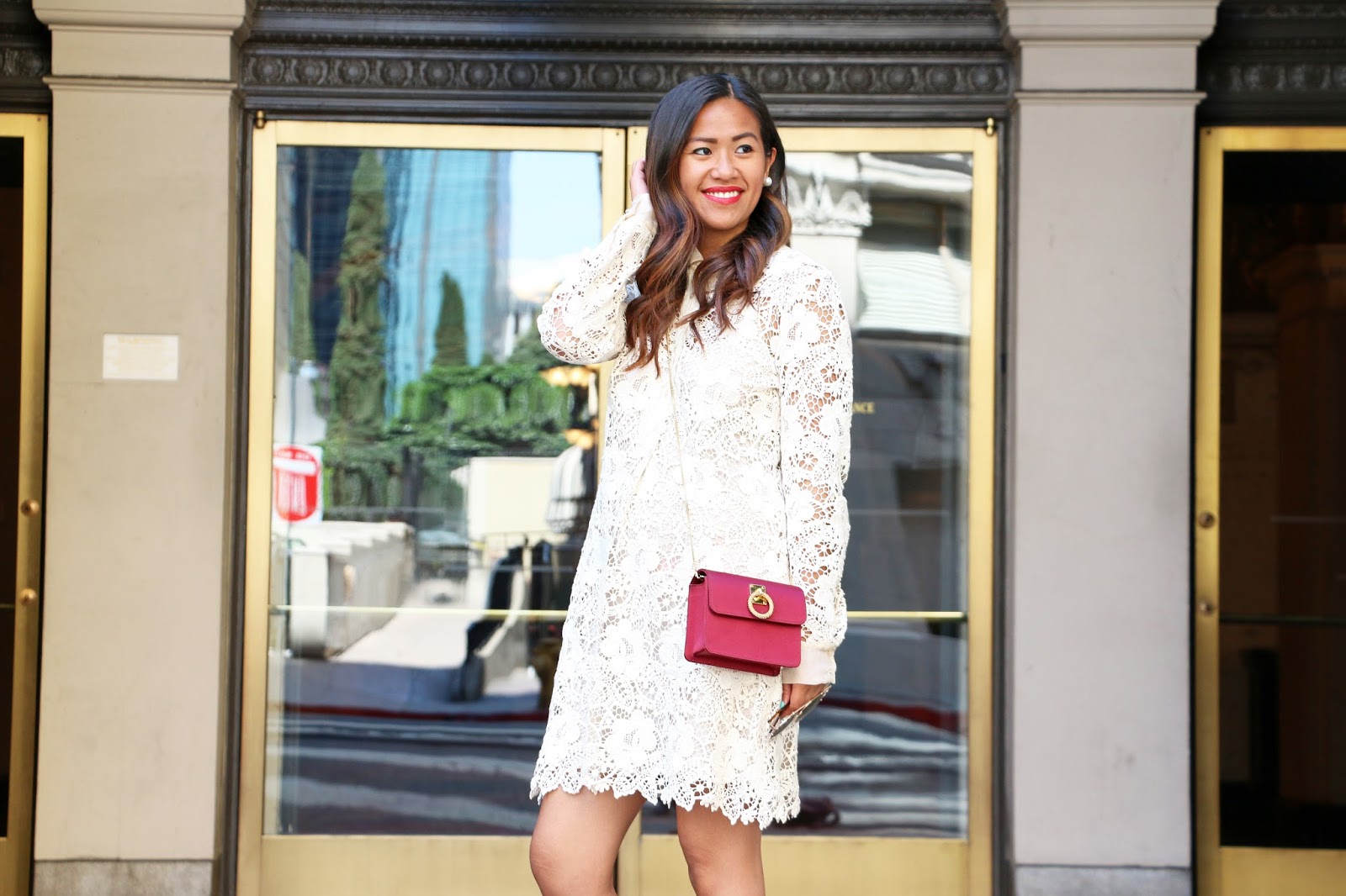 My all-time favorite lacy dress – perfect for the spring and summer! This dress is very versatile and matches with almost everything in my closet! Today I styled it with medium colored tones such as these brown floral printed booties from Public Desire and my JLondon cross body purse, with big gold mirrored sunnies.