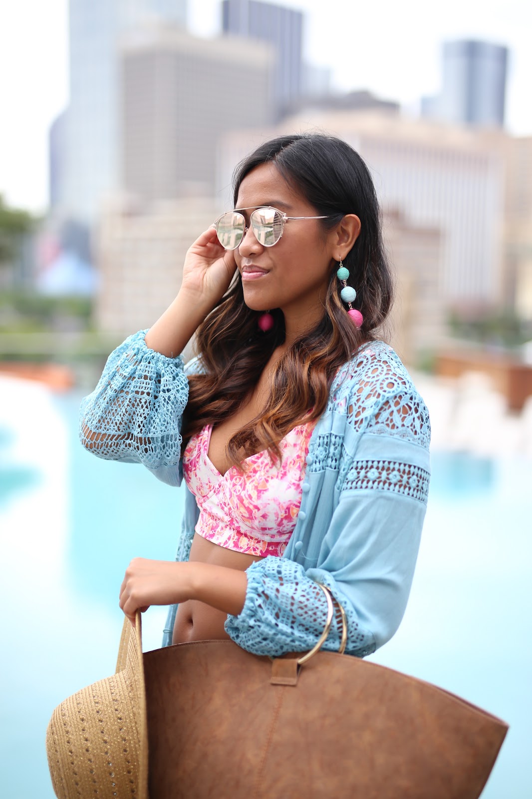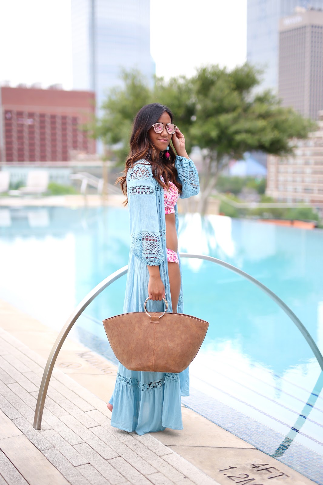 I am loving this cute and flirty pink two-piece swimsuit from Adore Me (click there to enjoy your first set for $24.95). I wore my blue bohemian style maxi dress which worked well as a cover up as well.