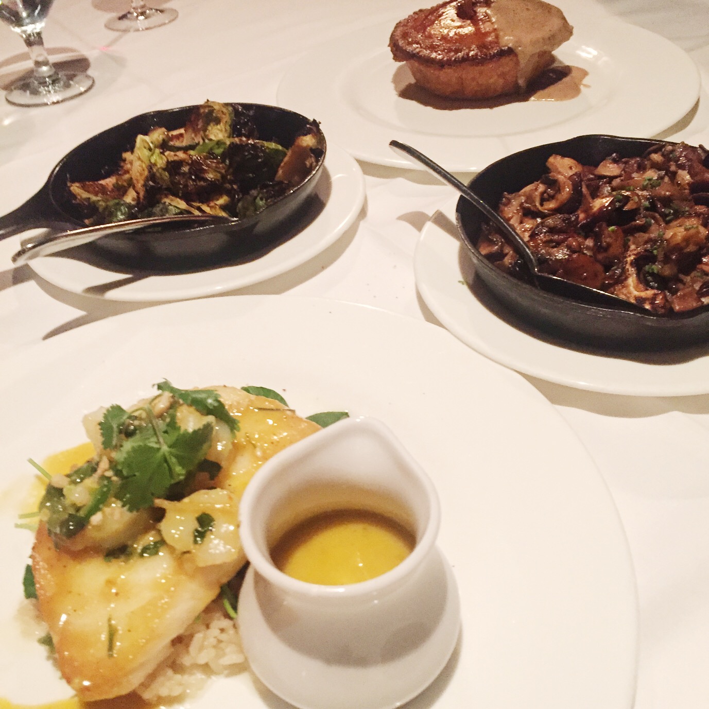 Then there was the entrees: Chilean Sea Bass, Pheasant Pie, with sides of brussel sprouts and mushrooms.