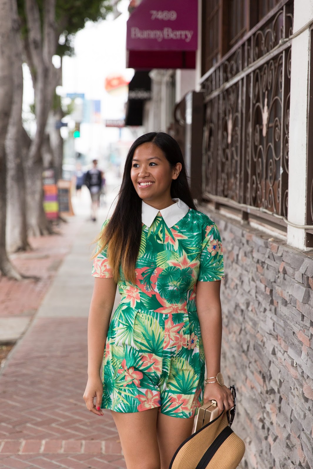 Rompers are a great summer piece, they are basically a “one stop shop” look, great to put on and only thing to worry about is accessorizing! I love how the print itself has vibrant colors, making it the center piece of my look. I easily accessorized this look with a floppy sun hat, sunglasses, nude heels and a nude clutch.